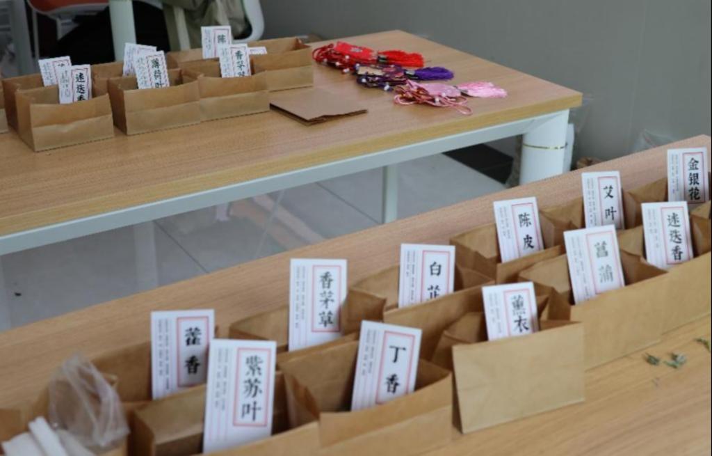 “香囊纳福”环节营造了“微型中药铺”的沉浸氛围,陈列艾叶、菖蒲、丁香等十余种天然香料,并辅以详尽的功效图文介绍。师生们依据个人喜好自由搭配药材,装入精美的锦囊或刺绣布袋,亲手制作出香囊,或佩于腰间或与鲜艾枝相融合,让传统智慧化作可佩戴的“流动文化课堂”。