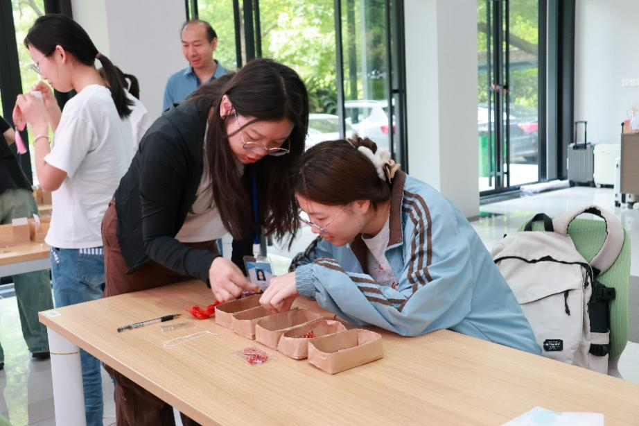 在“五彩连福”互动区,参与者们在工作人员指导下学习编织寓意吉祥的五彩绳,并选用古钱币玉器、平安铃铛等特色挂件进行装饰。大家或为同伴系上寄托祝福的手链,或将流苏坠饰装点随身物品,使非遗编织技艺成为传递同窗情谊与节日祝愿的温暖载体。